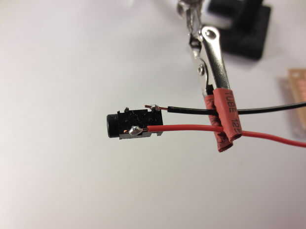 2. Cortar y pelar un cable rojo y negro de 2 pulgadas. Soldar el cable rojo a la derecha del circuito y soldar el cable negro a la izquierda del circuito. Asegúrese de que utilizar la correcta izquierda y derecha-desde la parte superior de la Junta. También asegúrese de que el frente de la toma es hacia los cables rojo y negro.