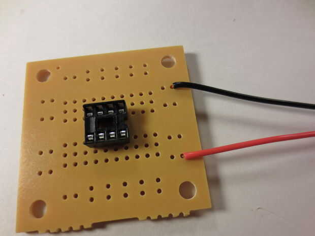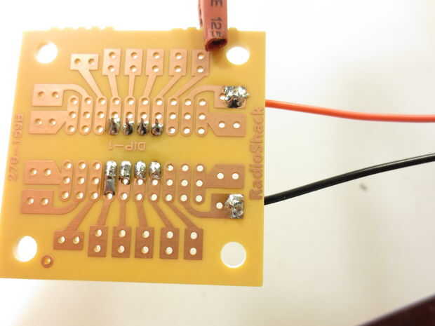1. Empezar por insertar a la toma de perf board el 8 DIP. Volcar el tablero doble los cables sobre el zócalo y soldarlos a las pastillas.