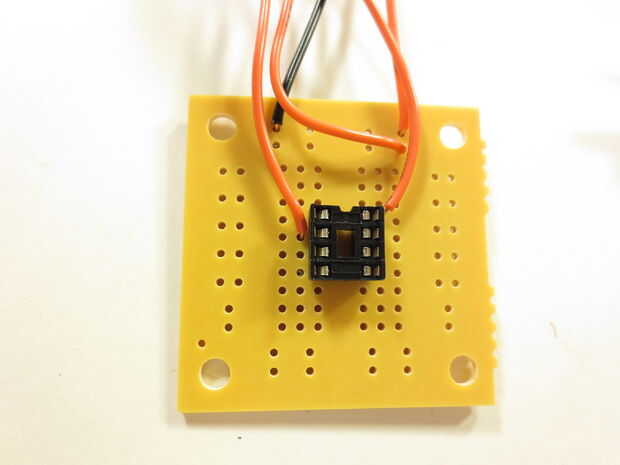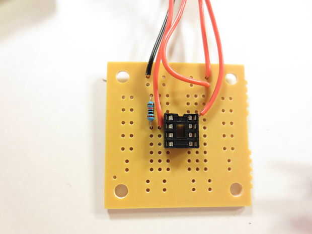 Su circuito hasta ahora debe tener un conector audio hembra enganchados hasta dos pads de soldadura en el tablero de perf, a continuación, un zócalo DIP 8 soldadas hasta la mitad. Permite añadir el interruptor.