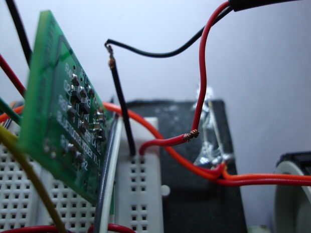 Cuando haya terminado de cargar el código, poder la placa de arduino por conexión para breadboard usando adaptador entonces conecte la batería a los carriles de la energía de protoboard usar clipes.
