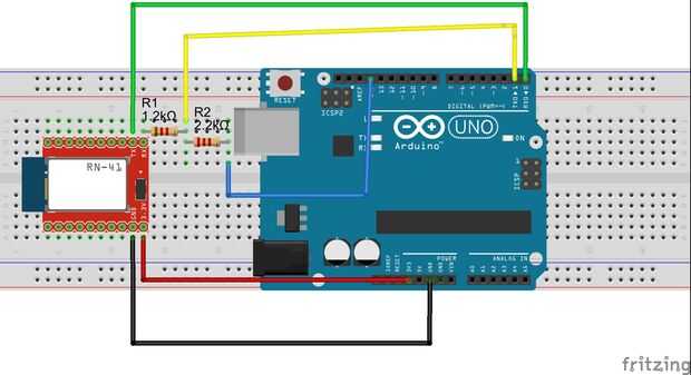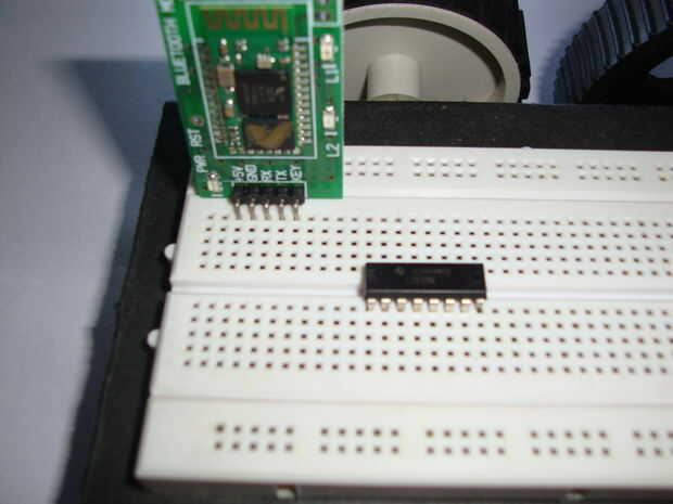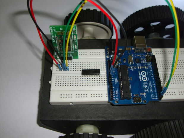 Nota: no he utilizado un divisor del voltaje para el módulo de bluetooth porque tomé las fotos primera sin lo sepa. Sin embargo todavía funciona sin agregar pero se recomienda utilizar un divisor de tensión. He añadido un esquema protoboard por encima con el divisor de tensión. Utilizar una resistencia de 1,2 k y 2.2 k para él.