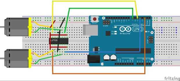 L293d es un circuito puente h doble controlador de motor integrado. Estamos utilizando porque arduino funciona a una tensión baja y requiere una pequeña cantidad de corriente para funcionar mientras que los motores requieren de un voltaje relativamente alto y la corriente para funcionar. El CI l293d toma entrada de arduino en la forma de lógica 0 y 1 y da un alto rendimiento suficiente para un motor de accionamiento. Tiene dos pines de voltaje y dos permiten pernos. Activar pines se conecta a vcc para activar los motores. Como queremos ya que los motores habilitados, nos estamos conectando ambos los pernos permiten al terminal positivo de la batería. Todos los pines de cuatro salida están conectados a motores y cuatro pines de entrada están conectados a arduino. También puede usar el l298 para este propósito. l298 es caro pero puede conducir más motores de potencia.