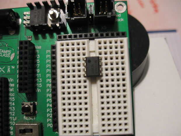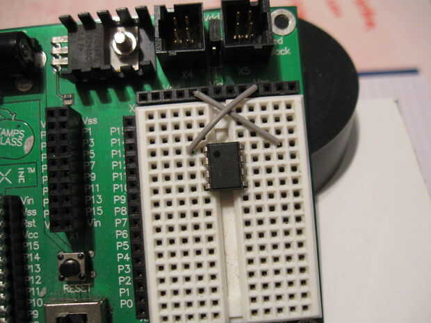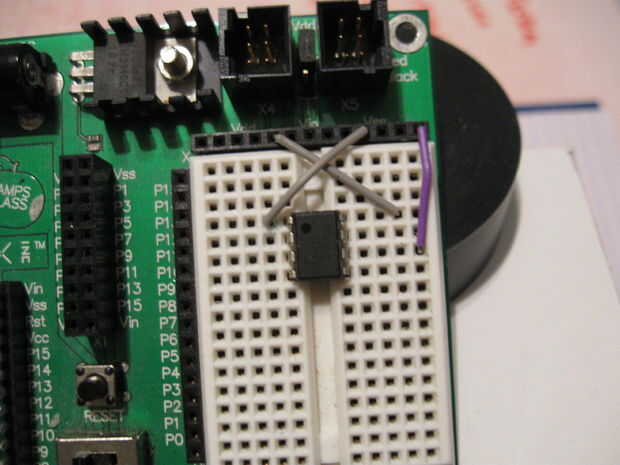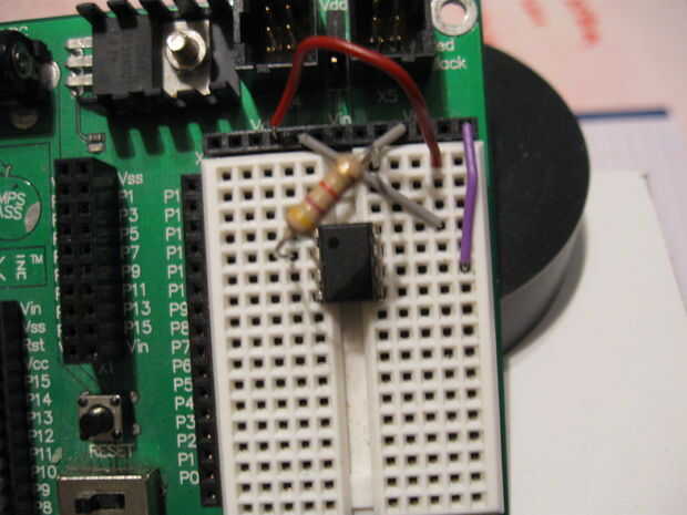 Paso 7. Conecte un peizospeaker para que la tierra se conecta con el pin 1 del 555 temporizador y un puente conecta su poder al pin 6 (u otro pin) en el microcontrolador.