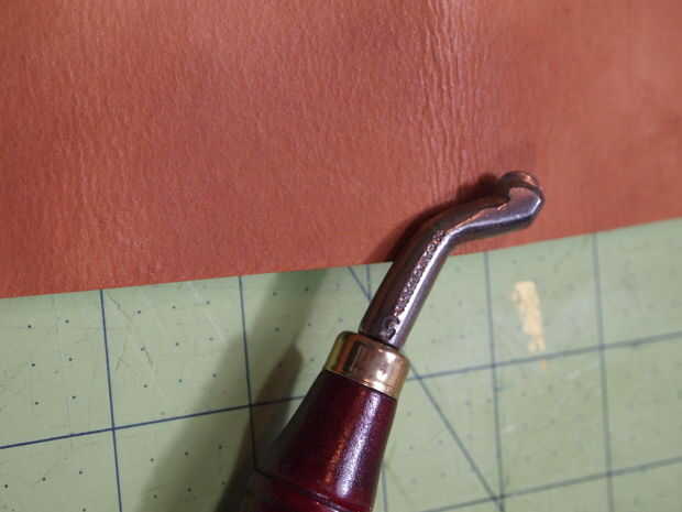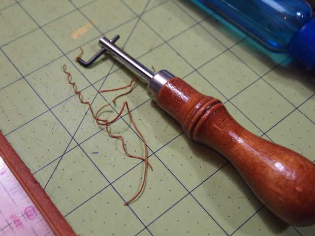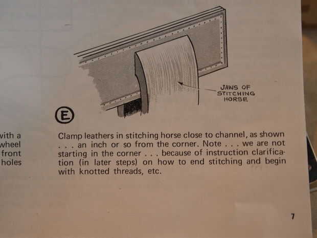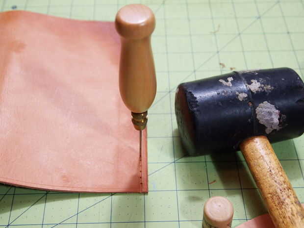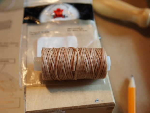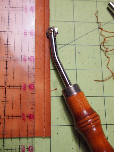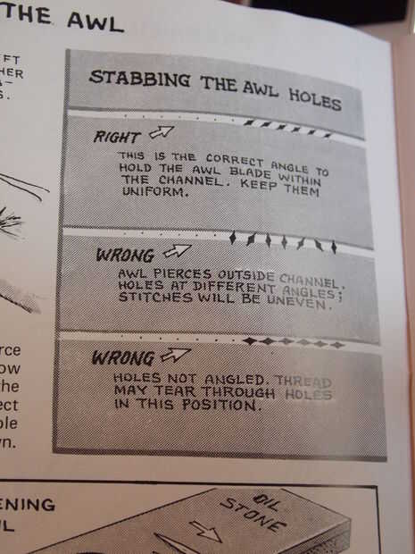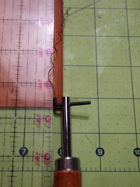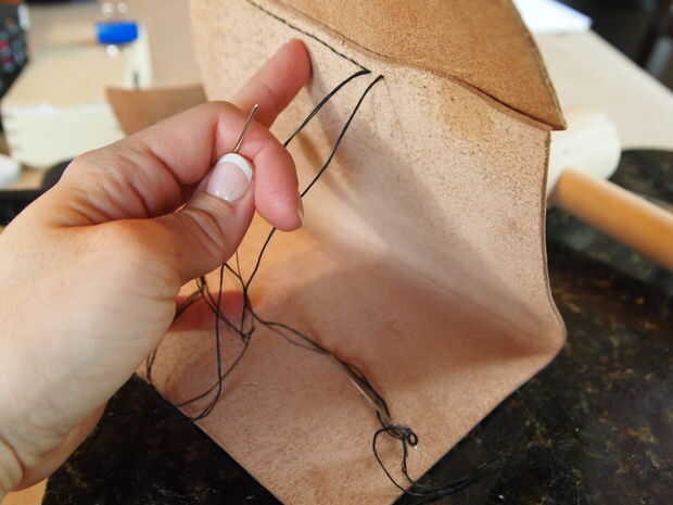 Unos 20 minutos más tarde, rocía la piel para conseguir húmedo y utilizar la herramienta de plegado, la ranuradora costura (que salidos de una línea de costura) y entonces finalmente el overstitch rueda para crear marcas para saber donde hacer los agujeros. Por favor ver las fotos de las demostraciones de cómo hice todo esto. Entonces, con unos tapetes de corte debajo de mi área de trabajo, utiliza el punzón para crear agujeros en ambas piezas de material a preparar para poner puntos de sutura a través de. La forma correcta de hacer esto es utilizar una pinza en un caballo de costura pero no tengo esas cosas - así que improvisé. Luego completé la mano-que cose - tirando el hilo lo mas ajustado posible entre puntadas. Es un poco difícil explicar cómo coser a mano de cuero, pero he encontrado una guía excelente foto aquí si es necesario.