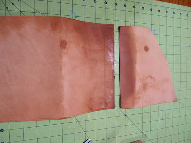 Si desea utilizar dos pedazos para hacer suya - entonces te llevo a través de los pasos aquí. En primer lugar, cortar las piezas de cuero. Por costumbre, entonces usé el borde plegado herramienta en los bordes exteriores (ver fotos). Tengo el cuero mojado - rociada para poder doblarlo y comenzar a darle una forma básica. Una vez seco, luego corte la pieza de aleta de material. Mi piel de la aleta era ligeramente más delgado que el resto así que fácilmente lo corte con unas tijeras. En el momento de hacer esto, sólo tenía hilo negro nervio y eso es lo que utilizaba para coser los pedazos juntos. Me alinearon las piezas y rociar con agua. Luego, les pegué junto con el adhesivo. Usé un cepillo para el adhesivo en una sola pieza de cuero y luego el otro. Les dejo sentarse y consigue pegajoso antes de poner las piezas juntas. Colocan algo pesado a lo largo de las piezas que solo pegué.