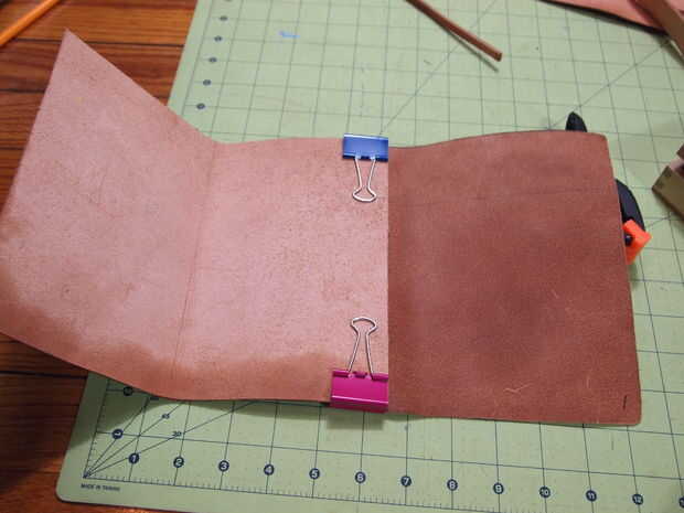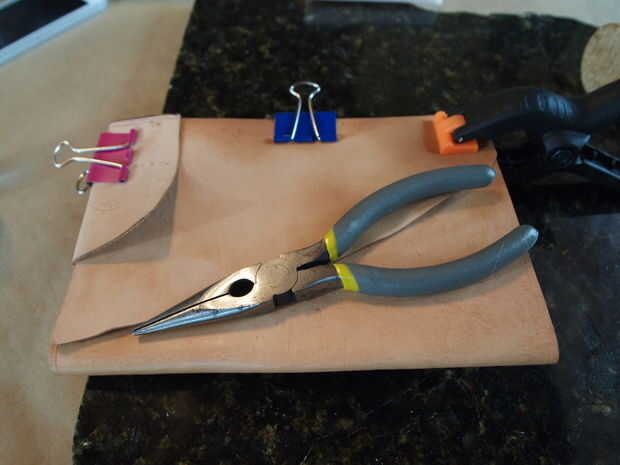 Una vez realizada la costura, es hora de reformar el cuero. Incluso si no haces ninguna costura como que tenía una sola pieza de cuero, usted necesitará hacer esto ahora. Rocíe todo el cuero y hacerlo agradable y húmedo. Luego, que necesitará terminar la tableta en envoltura de plástico (o incluso utilizar un libro que está cercano de tamaño) y ponerlo en el cuero. Personalmente usé un libro que era similar en tamaño a la Kindle. Luego, en forma de la piel alrededor de él y poner algo sobre ella (para evitar marcas de pliegue de los objetos) y colocan algunos objetos pesados en ella que seca. Tenga cuidado si poniendo la tableta en él al hacerlo. Puede utilizar las pinzas también pero tener super cuidado que usted tiene algo debajo de la abrazadera que está protegiendo el cuero sí mismo así que no hay pliegues extraños por todas partes. Vea imágenes por favor.