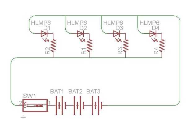 El esquema es muy simple también. Todo lo que es es 3 pilas conectadas en serie para formar 4,5 voltios, entonces el LED con sus resistencias conectado a la batería. Su es también un interruptor en el cable negativo entre las baterías y los LEDs. He adjuntado el esquema a continuación.