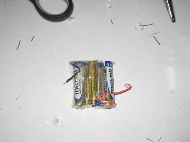 En primer lugar, usted necesita construir el paquete de baterías. He utilizado 3 baterías AA. Para ello, pegue las 3 baterías juntas, lado a lado, así que si te fijas al final de las pilas, se verá bien +-+ o- + -. Esto hace que una batería más compacta que si usted acaba de poner las pilas a un extremo. Ahora, mirando hacia abajo en la batería, usted debe ver- + -. Cinta adhesiva un pedazo corto de alambre al polo negativo de la batería primero. Con cinta adhesiva el otro extremo del cable al polo positivo de la segunda batería. Ahora con cinta un alambre largo al último poste negativo de la batería. Se trata del plomo negativo de la batería acabada.