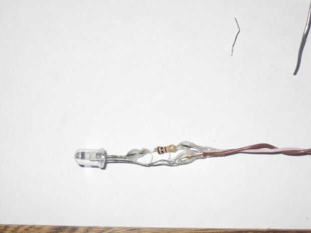 Comience soldando la resistencia que va contigo LED al cable negativo de su LED. Luego, soldar un cable al positivo de lo LED y al otro lado de la resistencia. Cubre todas las conexiones con pegamento caliente para hacerlas a prueba de agua.