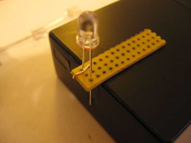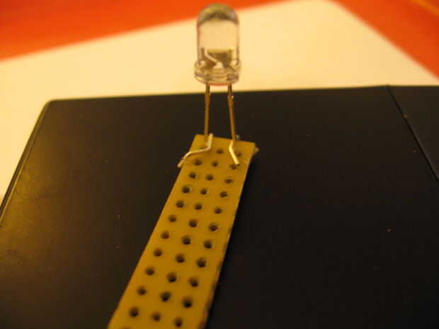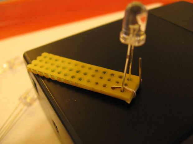 LED1 se montarán en la parte superior de la tarjeta de circuitos de bulbos. Primero elige qué extremo de la tabla va a ser la parte superior. Esto será el final que es más suave. Las perforaciones cortadas bruto le ayudará a mantener los contactos en el extremo inferior más tarde. Nada en la parte superior para que no te preocupes no lastima. Simplemente coloque el extremo más pronunciado en la parte inferior. Ahora deslice LED1 dentro de los agujeros exteriores superiores y doblar las piernas por el tablero y respaldo entre ellos mismos. Luego doblarlas hacia abajo y hacia afuera como se muestra. Usé un hemostato a Coloque los cables debajo y a través de ellos mismos y doblado hacia fuera. Envuelva el vendaje muy apretado. Envuelve una pierna a la vez en LED1.