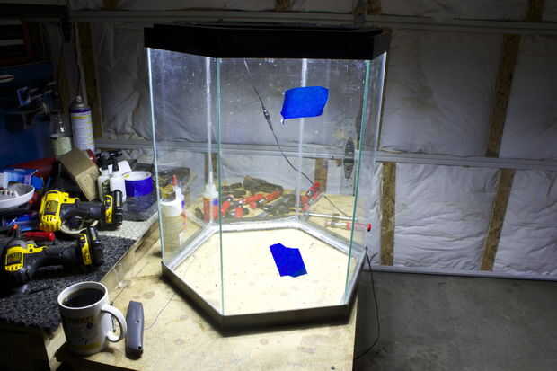 Recogí un tanque del acuario hexagonal 20 galones usado en Craigslist por 5 dólares. Este es el tanque de tamaño perfecto para mis ranas 2 claras. El tanque de vino con unos focos de calor y platos pero no tenía superior a él. Ranas blancos como un tanque más alto y el tanque tiene una buena cobertura sólida, así como la buena ventilación.