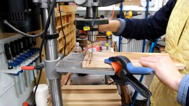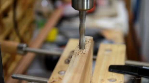 Ahora, vamos a trabajar en la base un poco. Así estoy perforando un agujero en el lado de aquí, es donde quiero que el tapón de ajuste. En la parte inferior de la pieza estoy perforando un agujero grande con una broca forstner, y es donde los cables se conectarán desde el enchufe para las luces. Entonces necesito hacer un agujero en la base aquí para que puedan alcanzar el cable que viene por la espalda en la parte inferior de la lámpara