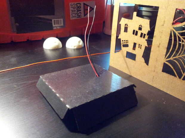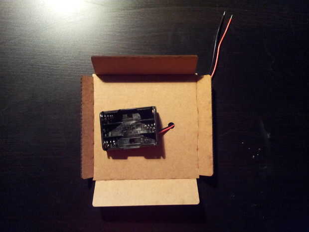 Ahora toma los lados de la linterna (pedazo largo de cartón con todas las fotografías en él) y sostener la imagen de la casa. El agujero de rectángulo que falta en la casa es donde irá nuestro interruptor. Vamos a cortar el cable positivo (rojo) en nuestra batería de tal forma que el interruptor está alineado con el agujero en la casa.