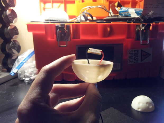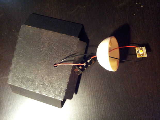 Una vez que has soldado el LED a los extremos de la batería, es hora de colocar para una óptima iluminación. El LED de la curva tal que apunte hacia abajo. Ahora, levante la mitad superior de la luna y coloque la baja de apenas media baja bastante a lo largo del cable para montar el LED en la parte superior de la otra mitad de la luna. Deje caer un poco de pegamento caliente en la parte inferior de la luna más baja para mantenerla en su lugar en el cable.