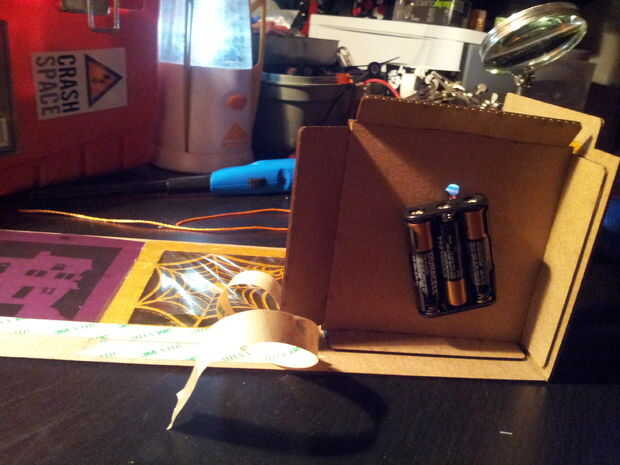 Una vez que la linterna se rueda casi en su totalidad en la base, doblar la tapa junto a la imagen del gato y alguna cinta de doble cara aquí. Esto se utilizará para apriete los lados de su linterna.