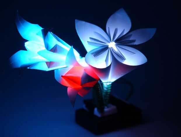 hice un florero de origami con un ramo de lirios de papel (54) con LEDs en el centro. Cada LED está conectado a un par de cables que se conectan a una batería recargable en la base (los cables también actúan como tallos de la flor). La batería es car