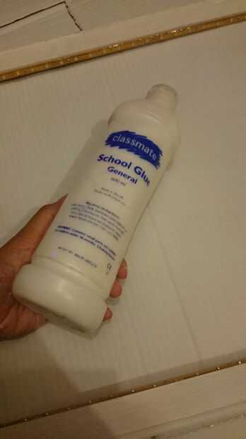 Ahora tienes una pieza que se pegue en la parte posterior del marco. Usé pegamento PVA. Untar el pegamento todo el camino alrededor, excepto el área donde la tiras de LED extremo, porque tienes que empujar los cables en esa esquina