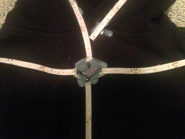 5. Coloque las tiras de LED con cinta adhesiva y pegamento caliente como se muestra en las fotos