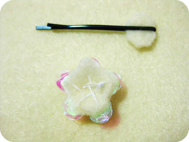 Corte un trozo pequeño de fieltro e inserte entre una simple horquilla/horquilla. Esta pieza de fieltro debe ser menor que la parte posterior de la flor.