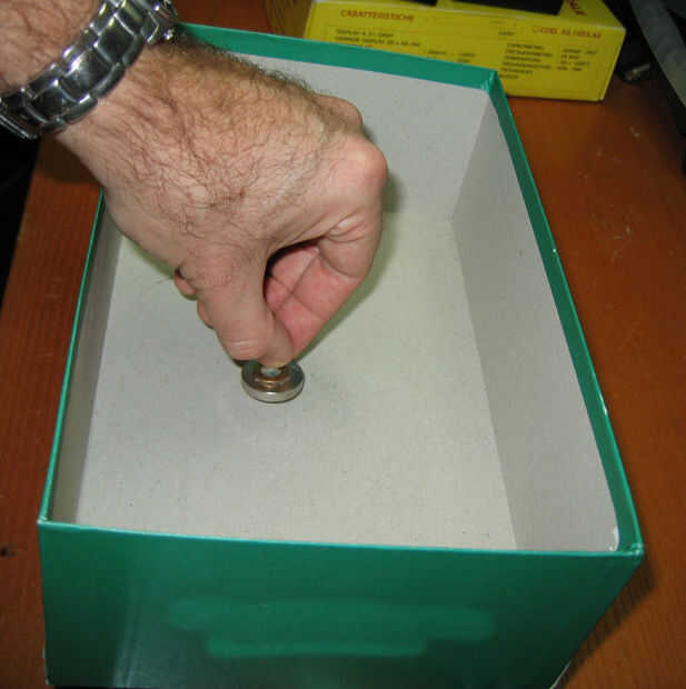 h) ahora es necesario encontrar el centro de la base magnética. La parte superior se desliza en cada dirección pero después de algunos intentos (movimiento alrededor de la base de la caja) debe ser suavemente atraído desde abajo y probablemente debe ser estable. Has encontrado el punto de partida . Si no eres capaz de encontrar ese estado trate de cambiar la altura del puente agregando o quitando algunos mangas. Para un ajuste fino de la altura use algunas hojas de papel doblado en lugar de las mangas.