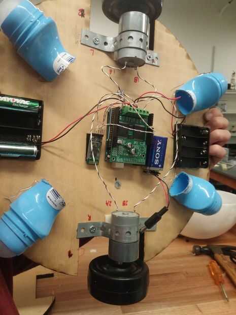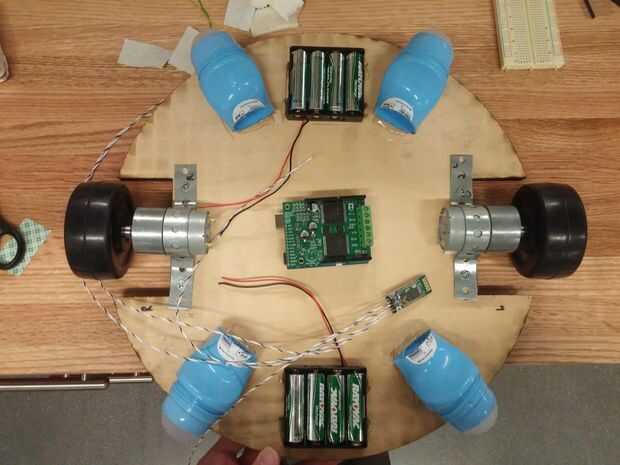 Utiliza un rollo de tira de metal con agujeros, formó una abrazadera para montar las ruedas, que entonces nos atornilladas utilizando un taladro. Adjunto el escudo del motor encima del Arduino y utiliza Velcro para unir todo el módulo en el centro de la tabla de madera. Somos caliente-pegado los dos compartimientos de baterías AA y rodillos desodorantes para el tablero de madera como se muestra en las fotos.
