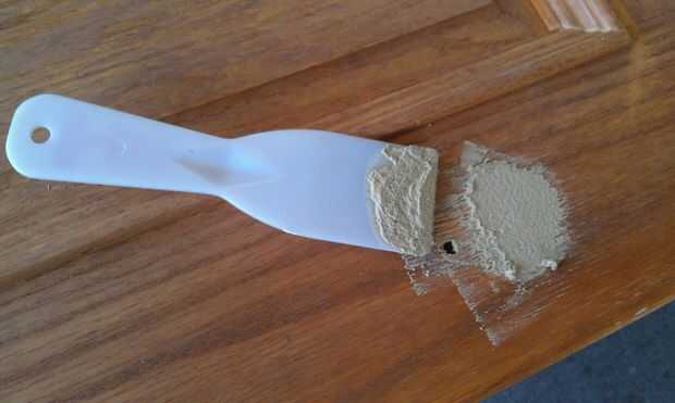 Paso 2: Usando una espátula, alisar sobre, pero no totalmente al ras de la superficie de la puerta. Puesto que el hueco de mi puerta fue a través de todo el camino hasta el otro lado, fue duro para asegurarse de que estaba teniendo tanto relleno en el agujero como sea posible. No se arriesgue usando muy poco, así que siéntete libre aplicar demasiado. Que este se siente hasta que esté completamente seca. Si el agujero no va a través de todo el camino al otro lado de la pieza de madera, no tiene por tanto, y usted puede rasparlo un poco por lo que es más uniforme con el resto de la madera. Dejar el relleno para que se seque, consultando las instrucciones en el envase de relleno si no está seguro de cómo mucho que esperar.