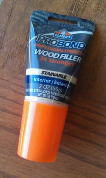 Paso 1: Obtener un relleno de madera. Utiliza relleno de madera ProBond de Elmer y aseguró que podría ser pintado o manchado sobre. Cortar la punta del aplicador y empuje de la masilla en el orificio.