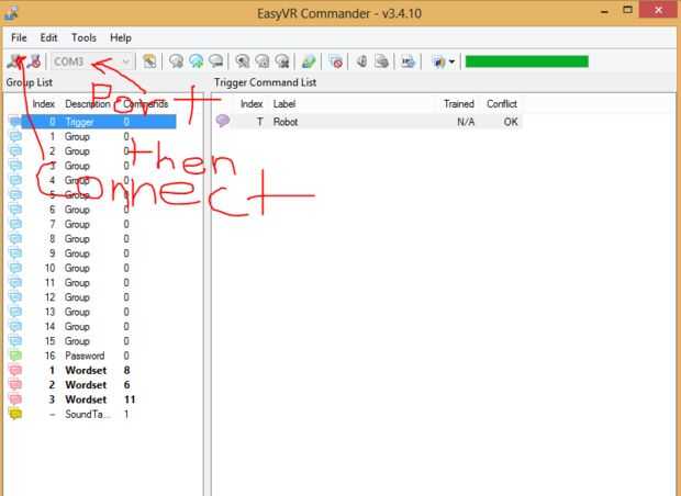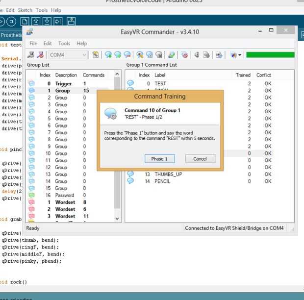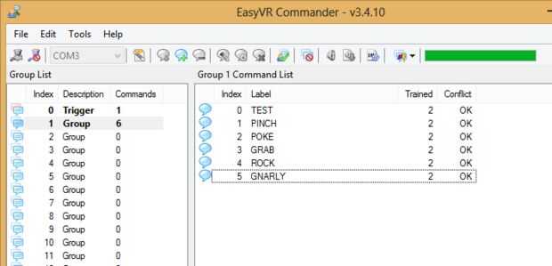A continuación que tendrás que entrenar EasyVR a conocer su voz para estos comandos. Haga clic en el primer comando 'TEST' y luego en la barra de herramientas en la parte superior de la ventana seleccionar el comando de' tren' botón y una ventana le pedirá que haga clic en 'Fase 1' y luego hable la palabra claramente en el micrófono. Mi consejo es decir las palabras normalmente unos seis pulgadas desde el mic, a veces le encuentro demasiado pronunciando palabras y cuando realmente trató de utilizarlas no diría MOUSSSSSEEEE, me gustaría decir ratón. Después de la fase 1 lo solicite 'Fase 2' y luego después de la palabra debe estar correctamente capacitada. Repita para cada comando. Después de la capacitación puede hacer clic en el botón de 'Comandos de prueba' en la barra de herramientas y te pedirá que decir una palabra en su lista y luego sombree la palabra correspondiente. De miedo! Gran hermano puede estar escuchando...
