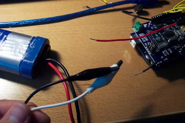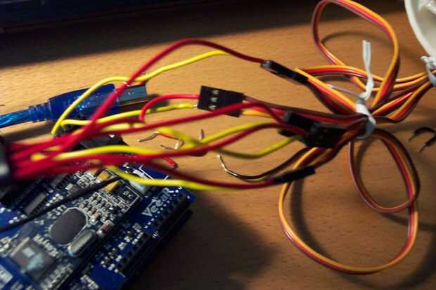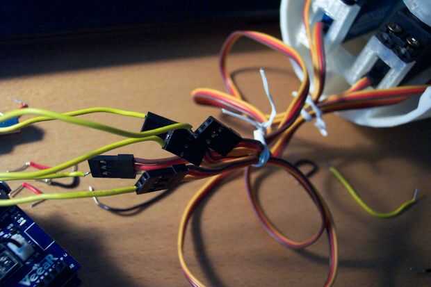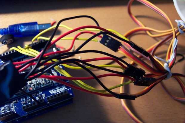 recomiendo breadboarding tu circuito (aunque es muy simple) antes de soldar los cables entre sí. Básicamente todo el circuito consiste en conectar cada servomotor hasta un terreno, el poder y el cable de señal. El suelo los cables todos combinaran e ir a ambos el cable negro (-) de su 6V - 7.4V batería y una de las entradas de la tierra en su arduino (hacer que al hacer esto!!! Me causó cierta confusión cuando se me olvidaba). Las líneas de energía todos ir al cable rojo (+) de la batería. Los cables de señal deben ir a los pines digitales del arduino siguientes: 3, 5, 6, 9, 10. Ahora vamos a probar los motores con un programa simple de arduino. El código se adjunta a este paso en un archivo TXT, solo copia pega en un nuevo sketch de arduino y subirlo a la arduino. Si usted tiene o no tiene el escudo de EasyVR adjuntarlo no hará una diferencia. Si nunca has usado arduino revisa este tutorial. El código sólo gira cada motor individualmente y pasará por todos ellos.