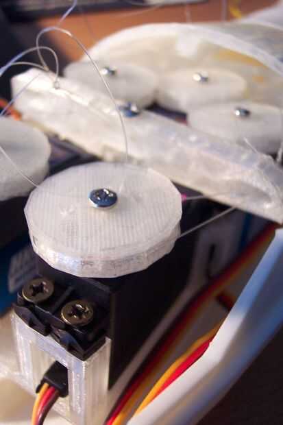 Ahora estamos listos para tensar las líneas de pesca a través del brazo para asegurarse de que cuando se mueven los servos se traza la línea y se mueve los dedos. Para ello aflojado el tornillo que sostiene el cuerno del servo el servo un poco por lo que todavía fue unido, pero la cabeza del tornillo se planteó de la bocina de tornillo. A continuación, había tirado en los dos extremos del sedal que sobresalen de sus respectivos orificios en la parte superior del cuerno del servo y les tiró firmemente. el dedo debe permanecer recto y resistir la flexión de una forma u otra. Sosteniendo todavía las cuerdas apretadas, envuélvalos alrededor de debajo de la cabeza del tornillo que sostiene el cuerno del servo en. Apriete el tornillo que aprieta hacia abajo en la línea de pesca apretado, sosteniendo en su lugar. Dejo el sedal sobrante para hacer ajustes más tarde (sólo se puede cinta hasta la parte superior del cuerno del servo). Repita esto para cada dedo. Ahora puede ejecutar el programa de prueba del motor otra vez y debe flex cada dedo individualmente.