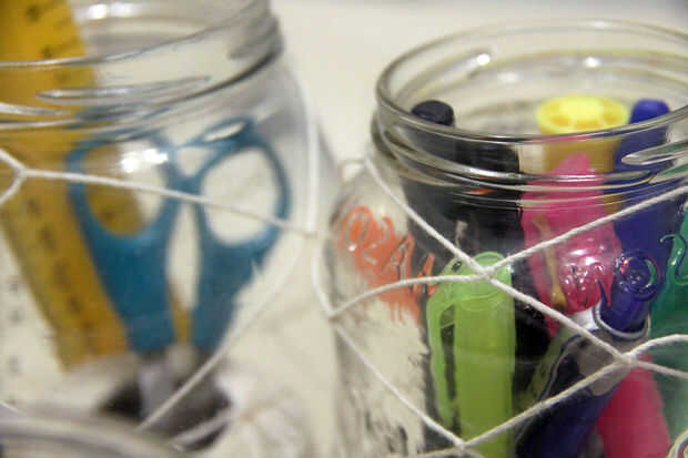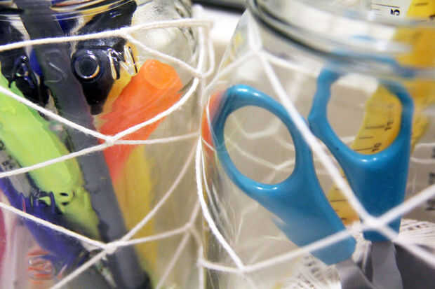 También puede optar para atar los extremos sin acabar alrededor de la jarra en su lugar, por lo que puede aguantar los nudos y colocar sobre una mesa en vez de colgar. Me gustaria colgarlos, pero cuando cambio para arriba y ponerlos en una tabla en su lugar, yo solo meta las hebras alrededor de la boca de la jarra.