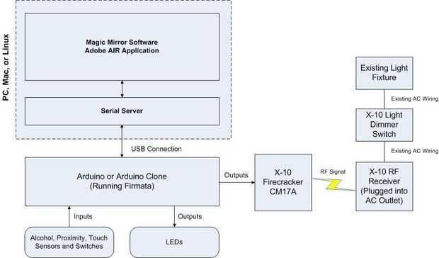 En el Arduino, tiene que cargar un programa llamado una firmado que vamos a usted controlar Arduino desde Adobe Flash (específicamente acción Script 3.0). Hay varias versiones de una firmado por ahí así que asegúrese de utilizar el que viene con la descarga del software Magic Mirror. También tienes que ejecutar un servidor serial (incluido en la descarga de software) que actúa como un intermediario conversión recibidos de la Arduino a un puerto de TCP/IP que Flash puede acceder a los datos en serie.