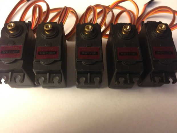 5 Servos x MG946R (o equivalente - MG995 o MG996 debe trabajar demasiado. He tenido un poco de problemas con el rango de movimiento, para servos que soportan un mayor grado de rotación sería mejores) - yo tengo la mía desde hobbyking.com, pero para una opción menos costosa iría con eBay (que vienen directamente de China, por lo que el envío puede tardar más).