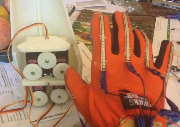 Sube el programa a Arduino (se adjunta el archivo de texto - "Hand.rtf") y asegúrese de que todas las conexiones del guante y servos son correctos. Ponga en el guante y gire en el Arduino. Los servos deben girar en base a cuánto se flexionan los dedos. Si este es el caso, está trabajando! Si eres más experimentado con Arduino y sabe cómo poner a prueba los valores de entrada de sus particular sensores, puede ajustar el rango en el programa para que funcione mejor para usted. Supongo que todos los sensores son prácticamente idénticos, pero si no lo están, esto podría ayudar.