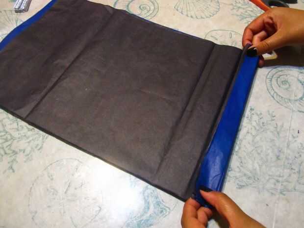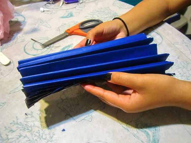 Cuando termine de cortar el papel en mitad, contar 15 hojas. Ya había usado 2 colores, tuve 8 hojas azul y 7 fichas negras. Después de ordenar fuera, doble estilo acordeón.