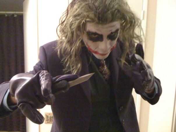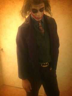 aqui tengo un traje casi totalmente casero del joker. Compré la mayoría de mis artículos de buena voluntad o la tienda de segunda mano y armar el traje de la pieza por pieza en cuestión de los últimos 2 meses. Teñido la gabardina y pantalón de traje