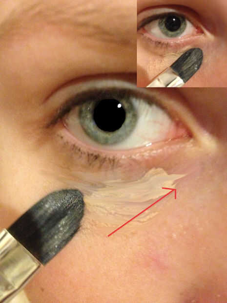 Frote unas cuantas gotas del producto sobre la piel bajo los ojos y usar el Pincel corrector para mezclar el producto en la piel. Asegúrese de que el color de tu corrector no es demasiado oscuro (por lo general, tratar de ir un tono más ligero).