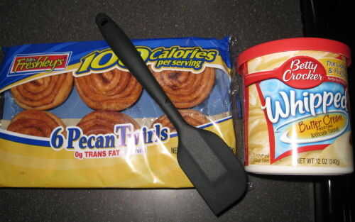-1 envase Betty Crocker (R) batida crema glaseado de mantequilla (u otras marcas/sabores por su preferencia). Generalmente en el pasillo de productos para hornear por alrededor de $1,70. Alternativas: hacer su propia crema de mantequilla o glaseado de queso crema; un montón de recetas en la web (yo no puedo atestiguar la nutrición información será el mismo, aunque el precio será probablemente inferior).