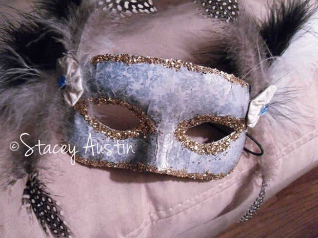 Usé un color azul agua buscando papel filigrana, oro brillo, plumas grandes (punteados, blancos y negros) 2 yoyo de en un tejido de filigrana crema y gemas azules. Simplemente usé el elástico que viene con la máscara en lugar de cinta, porque este es un diseño de peso ligero.