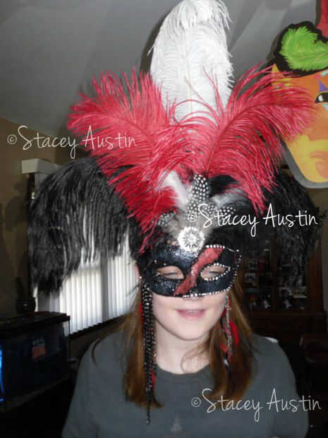 Esta es la segunda máscara. Gracias a mi amiga de hijas para el modelado de lo!Paso 1: fuentes deSe necesita:máscarapapel nacarado rosamod podgecorte de cinta decorativacintapaquete de plumas color rosas y blancostallo floral mariposabrillo rosafielt