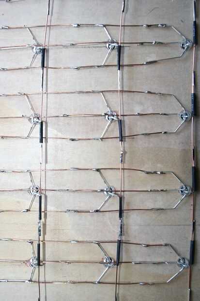 I corte y había despojado algún cable de núcleo sólido de cobre (del viejo cableado de telefonía) y soldar las filas juntos en sus respectivos colores.
