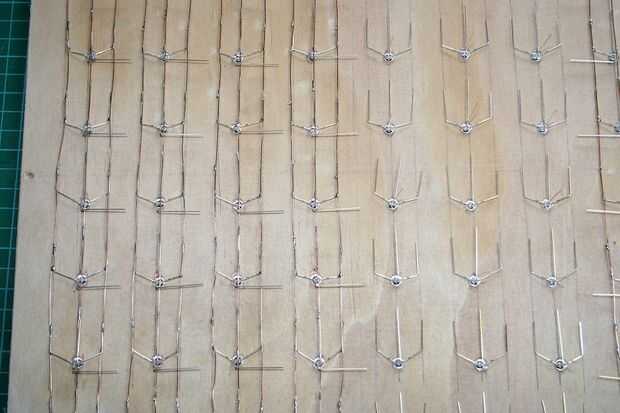 Para lograr esto, primero me medido hacia fuera y perforar los agujeros de 5 mm en la madera contrachapada. En mi matriz, los orificios están separada 35 mm y he dejado un margen de 20 mm alrededor de la Junta para la colocación de un borde en el panel (tanto para estética como para impartir cierta rigidez en el panel de 6 mm).