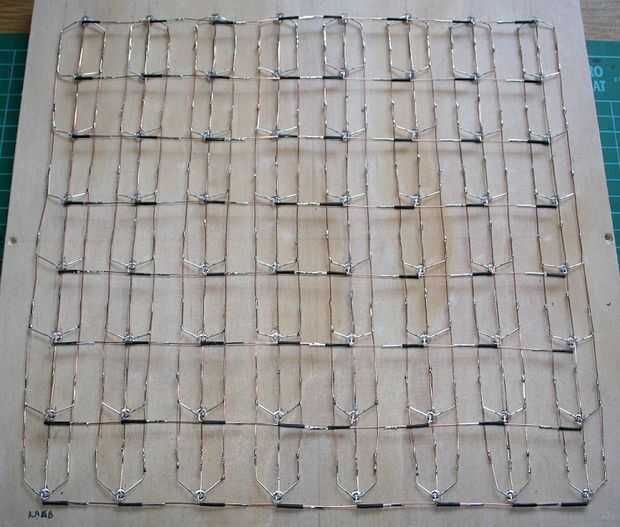 El LED entonces fueron insertados en el panel de la parte posterior y los pernos del cátodo se doblaron en sus horquillas.