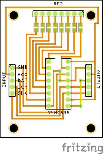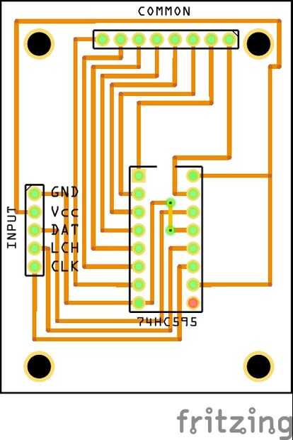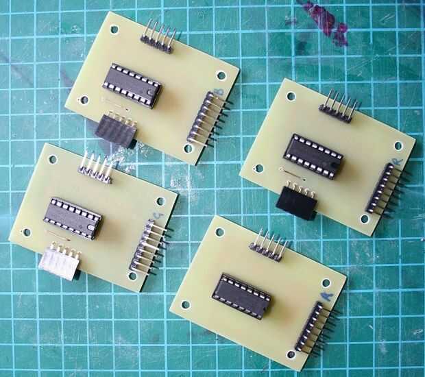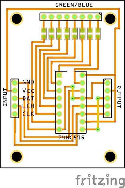 He diseñado mi cadena de cambio registra para ser modular - interconexión tableros "hermana", es decir, cada tabla tiene un bloque de entrada y salido de pines que pueden conectarse entre sí para hacer 4 tarjetas en total.