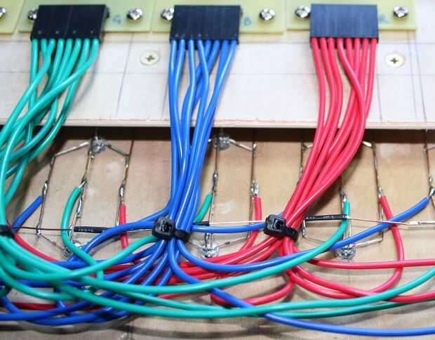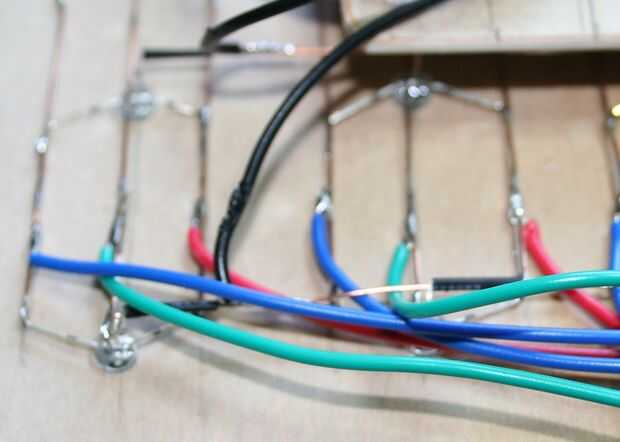Después de soldar las filas del ánodo, luego pasó al rojo, azul y verde de soldadura columnas. Cuando fui para soldar las columnas, pasé el cable debajo de la línea de ánodo por lo que hubo un aislado espaciador separa el ánodo los cátodos... a pesar de no protege a las otras filas de ánodo.