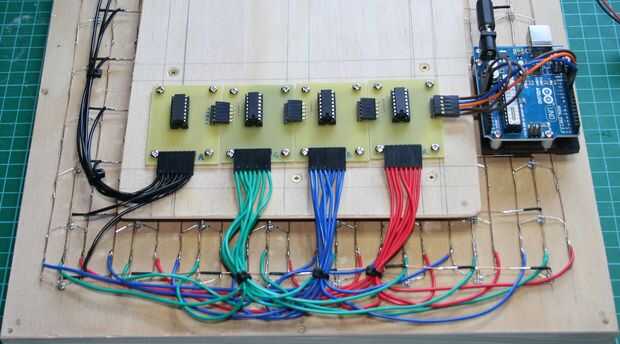Los separadores estaban pegados a la parte inferior de la matriz y luego la plataforma se atornilla en los separadores. Cada uno de los módulos de Margarita 74HC595 unieron luego a la plataforma con 4 M3 tuercas y tornillos.