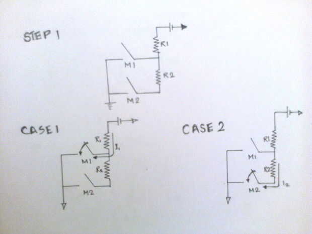Caso 1 representa la situación cuando se presiona el microinterruptor 1 (M1) el actual hace su manera a través de la batería, R1, M1 y al suelo.
