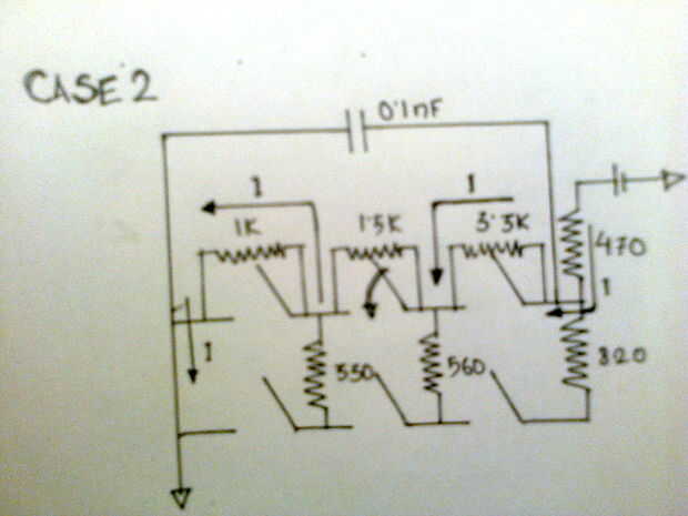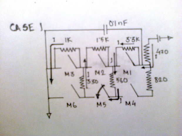 Caso 1. Cuando M5 se presiona la corriente primero pasa a través de 470 ohmios. k de 3,3. Entonces en este nodo piensa que nodo proporciona que menos resistencia desde su 560 es menos de 1,5 kohms (1500) por lo que toma ese camino entonces su hace su manera a través de 330 y finalmente 1k