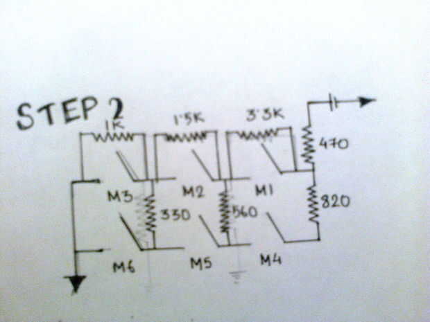 Una matriz de teclado es realmente un circuito divisor de tensión. Una matriz de m X n teclado tiene m filas y números columnas. En el micro interruptor se conectan resistencias de diferentes valores. En el paso uno en la figura anterior que observamos dos resistencias R1 y R2 están conectadas en serie y a través de ellas se conectan los interruptores micro. La desviación de los interruptores se muestran.