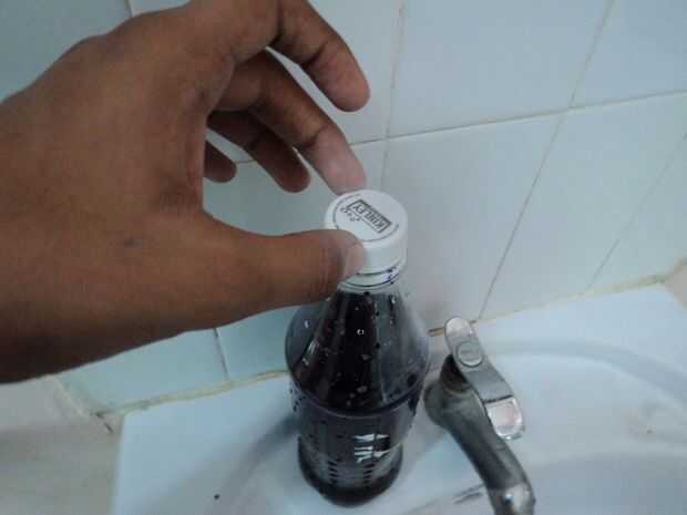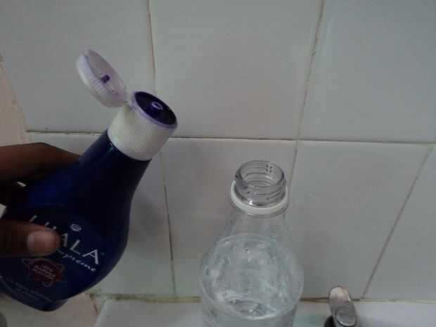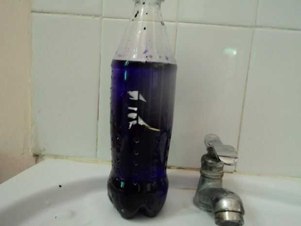 Llene la botella dejando algunos vaciar espacio de boca de la medusa y vierten unas gotas de colorante alimenticio o azul índigo y agite bien después de atornillar abajo de la tapa de la botella mezcla bien y hacer una verdadera solución de la misma.